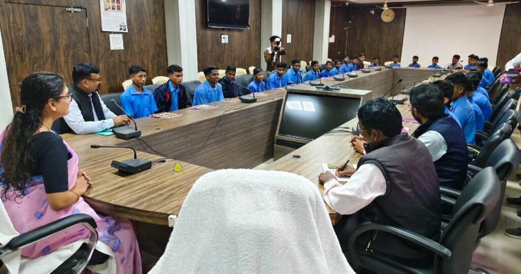 नारायणपुर, 19 जनवरी 2026// जिला प्रशासन की विशेष पहल से जहां बच्चे पूरे विश्वास और खुले मन से अपने सपनों, शिक्षा और भविष्य पर कलेक्टर से संवाद किया, जिसके तहत् आज जिला कार्यालय के सभाकक्ष में कलेक्टर नम्रता जैन ने मुख्यालय से सुदूर अंचल ग्राम धुरबेड़ा और मोहंदी के पूर्व माध्यमिक शाला से आये स्कूली बच्चों से मुलाकात किया। पिछली मुलाकात के दौरान अबूझमाड़ क्षेत्र धुरबेड़ा और मोहंदी के बच्चों द्वारा नारायणपुर आने की की गई मांग को जिला प्रशासन ने पूरा किया। इसी क्रम में जिला प्रशासन की अभिनव पहल “मावा माड़ : सपनों का संवाद” के अंतर्गत ग्राम धुरबेड़ा एवं मोहंदी के पूर्व माध्यमिक शाला के बच्चों को नारायणपुर जिले का शैक्षणिक भ्रमण कराया जा रहा है।उन्होंने सभी बच्चांे से उनके सपनों के बारे में पूछा तभी बच्चों ने कोई डॉक्टर, इंजिनियर, पुलिस एवं शिक्षक बनने हेतु जिज्ञासा साझा किया।